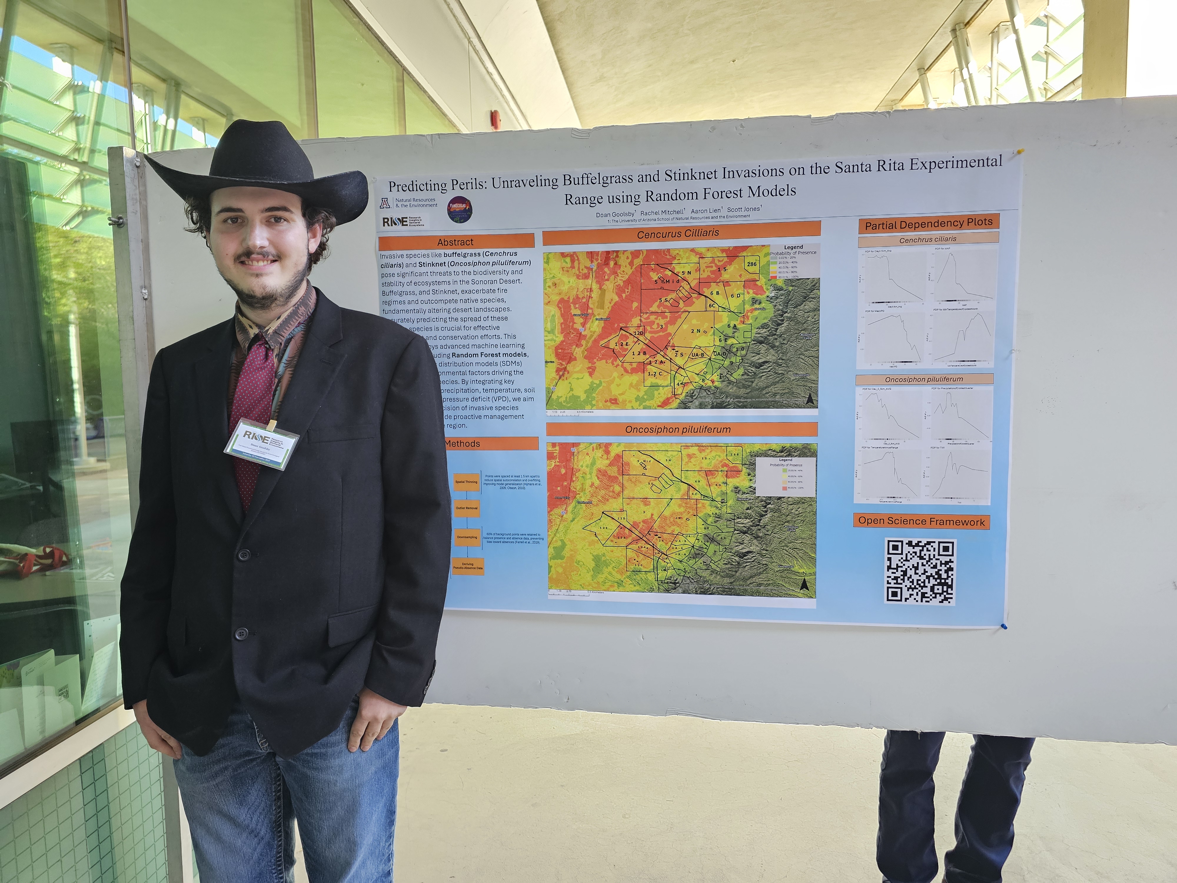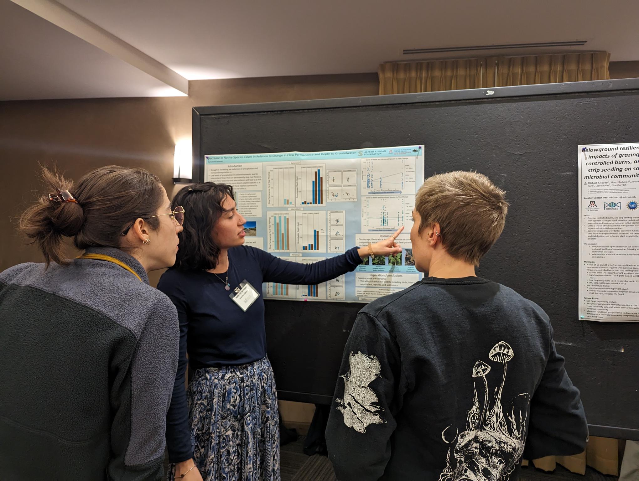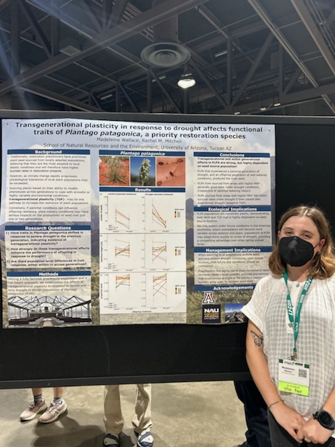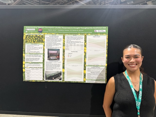Clockwise from top: Kat Sacoman at SACNAS, Ethan Taber at ESA 2023, Kat Sacoman at SERSW 2023, Maddie Wallace at SERSW 2023, Ian Winick at SERSW 2023, Virginia Javier at 2024 Honor’s Research Symposium, Virgina, Maddie and Ian at ESA 2024, Doan Goolsby at UA RISE Symposim 2024.